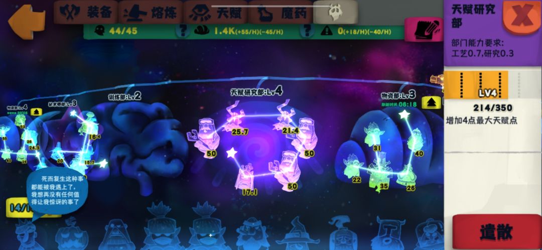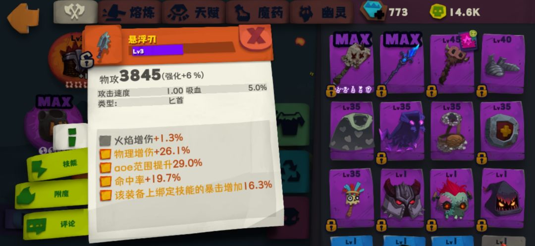 3、一切准备完成之后,就可以开始培养人物属性了。堆属性的逻辑永远是先堆伤害,再堆aoe。血爆悬浮最显伤的属性是:血量,暴击率,暴击伤害。用上面的资源先把血爆头和悬浮刃升到金色,基本上伤害就起来了,可以挂机远古T10以下,以及异界前两层。最后就是混日子等装备词条慢慢成型了。