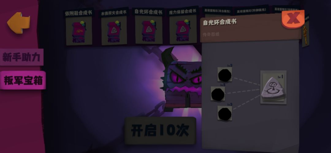 3、堆完资源之后,接下来是符文的搭配。除了两个自光环符文需要合成,其它的都可以购买,需要的符文见开篇的结果展示图。自光环的合成也非常简单,图纸的来源就是宝箱,赛季宝箱会送一个,抽叛军宝箱还会得一个: