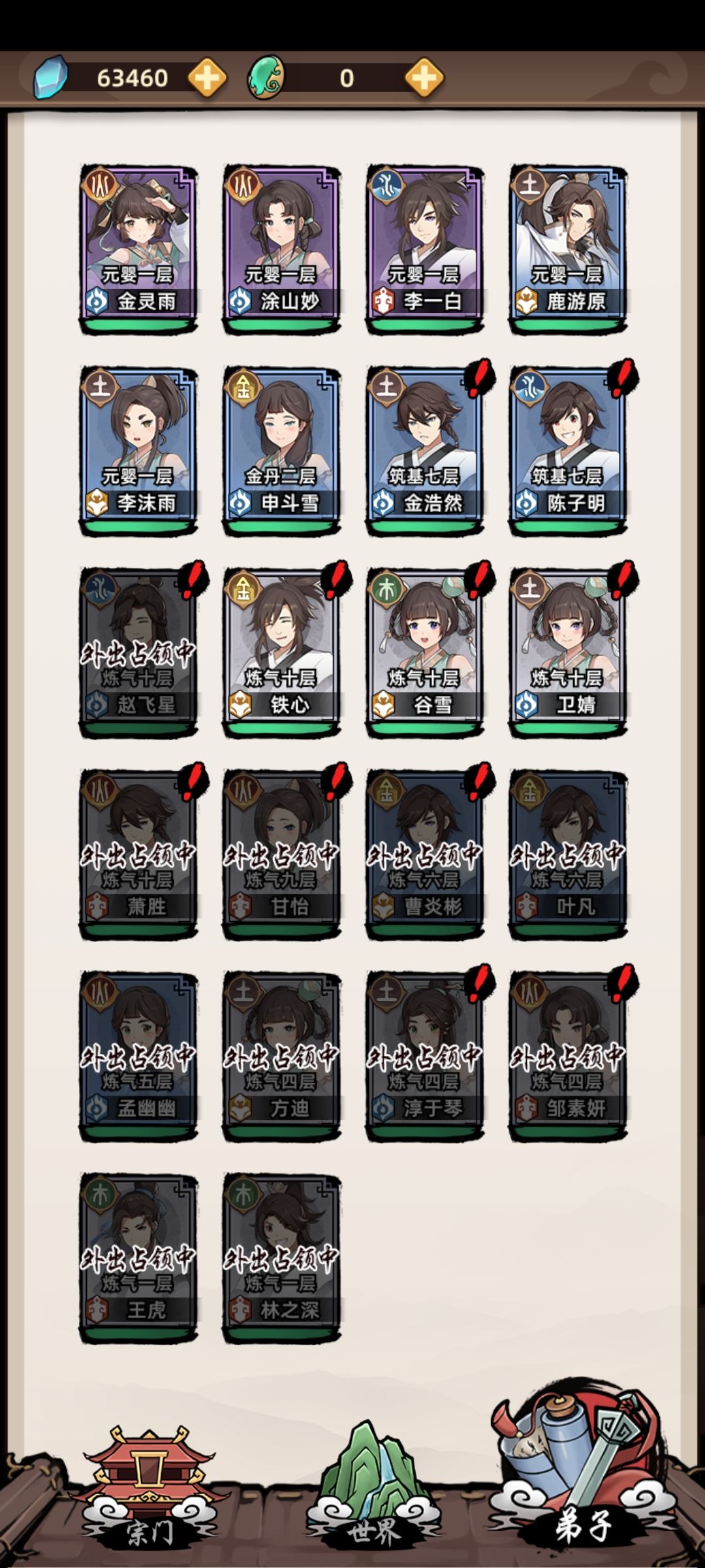 7.战斗弟子选择:两个前排肉盾三个火法肯定效率最高,其他无所谓,但两个前排肉盾不能少。肉盾死了后排扛不住几下。
