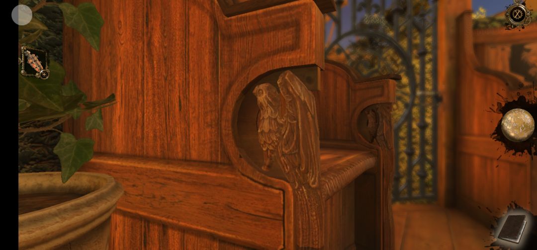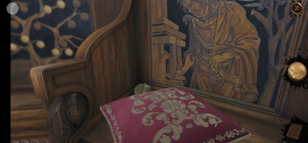 回到过去,点击花盆右侧的椅子,先将小鸟浮雕向右拖拽,再拖拽画圈处滑块,点击得到罗马数盘