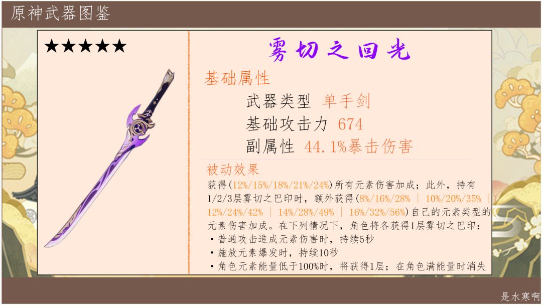哈喽大家好,这里是水寒啊!近日UP池更新,再次迎来了神里绫华以及其专武雾切之回光。本期攻略是雾切的一个评测贴,会分析其对各单手剑角色的适配性,彻底解读一下雾切的泛用性之高。