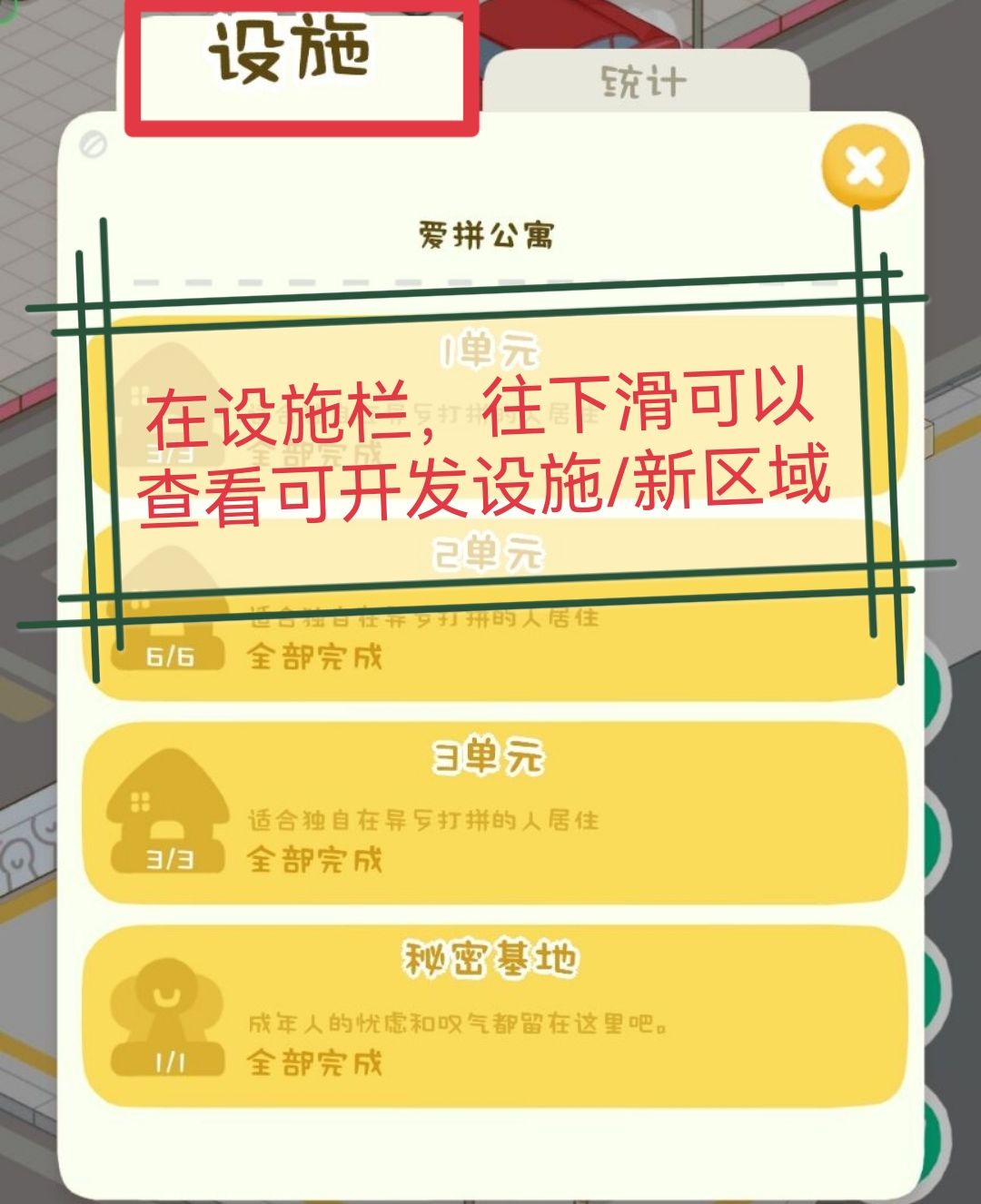A:同上个问题,点击铲子图标,然后在设施页面,直接往下划即可
