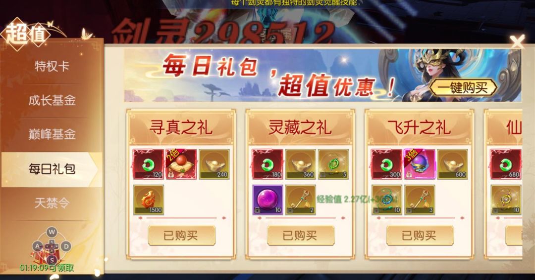 超值返利中拥有永久经验加成道具,最值得选择是“超级升级丹”。超级升级丹的效果是200级以前使用直升1级,200级以后使用获得26.5亿经验。而法宝器灵道具其实也不错,可永久提升25%经验加成,冲级霸榜必备的选择。