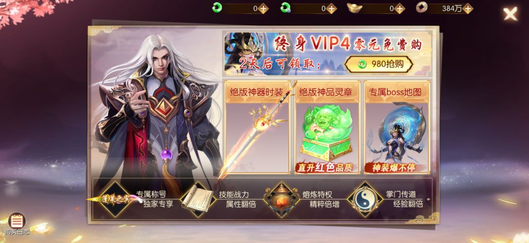 无论是什么类型的游戏,VIP都是一个至关重要的东西。这在这里,VIP4能提供100%的传道经验加成,同时游戏中的副本次数也会增加。而这样的特权在游戏前期就会产生出很大的优势,从而在前期就能拉开很大的差距了