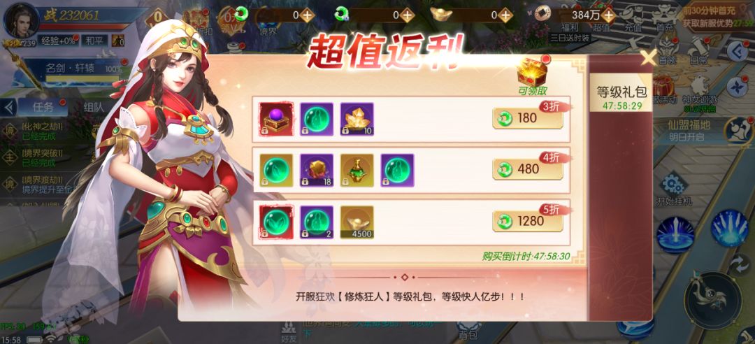每日礼包里面所售卖的道具也是非常不错的,最值得注意的是鸿蒙仙药·神(1天2倍经验丹)和鸿蒙仙药·仙(30分钟3倍经验丹)。而其他的道具其实也不错,比如元宝等对于后面的坐骑、宠物和战力榜也是有挺大的作用的,所以也是需要购买的。