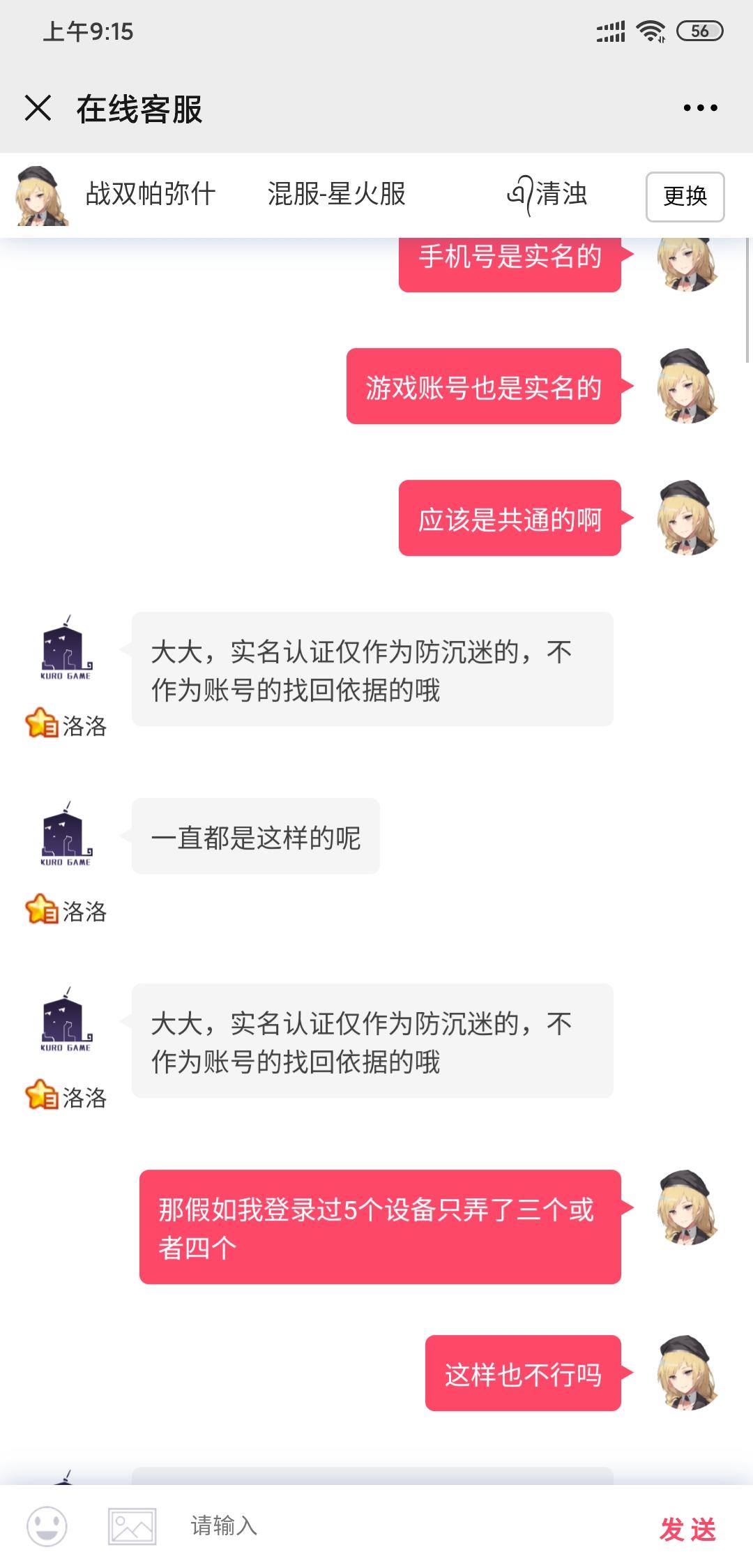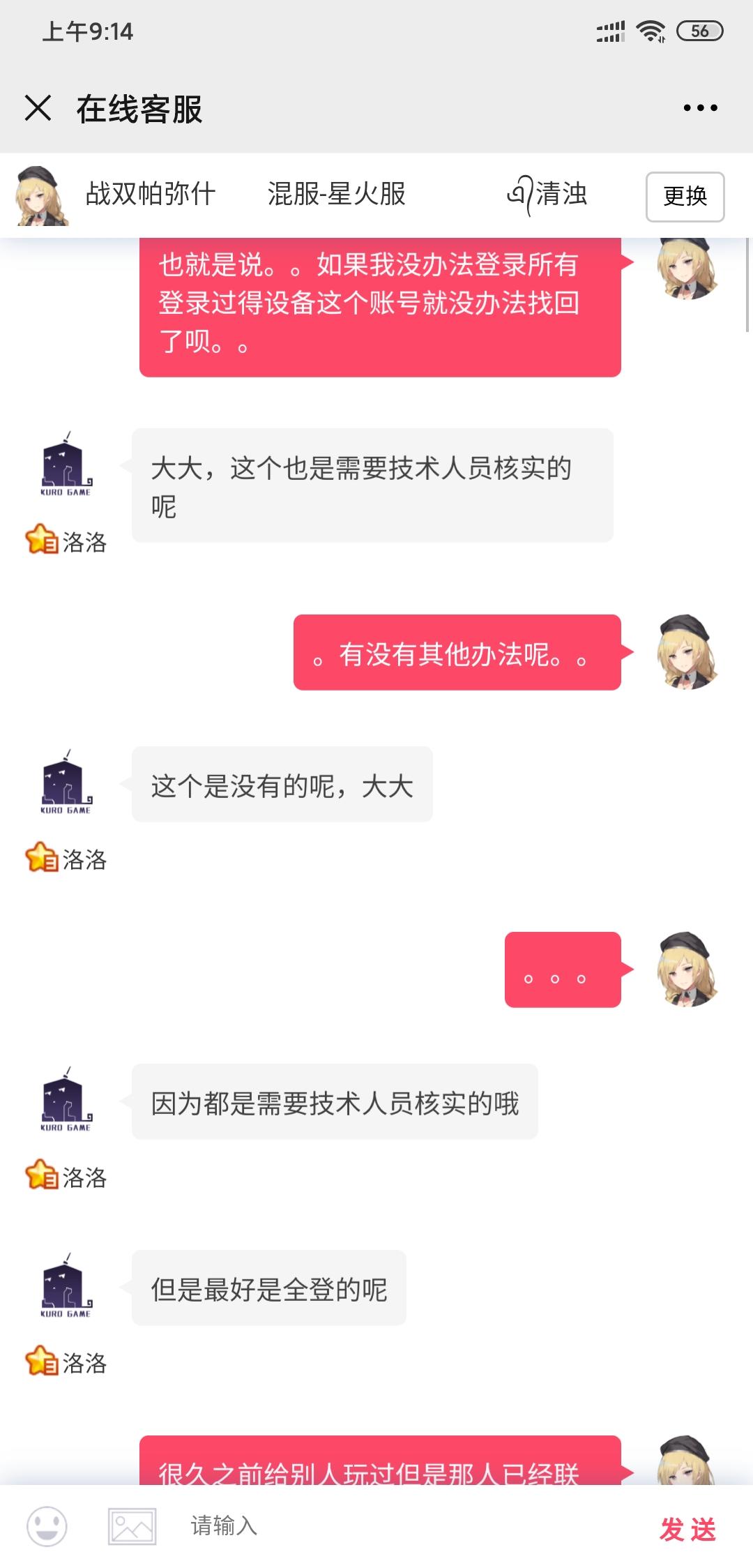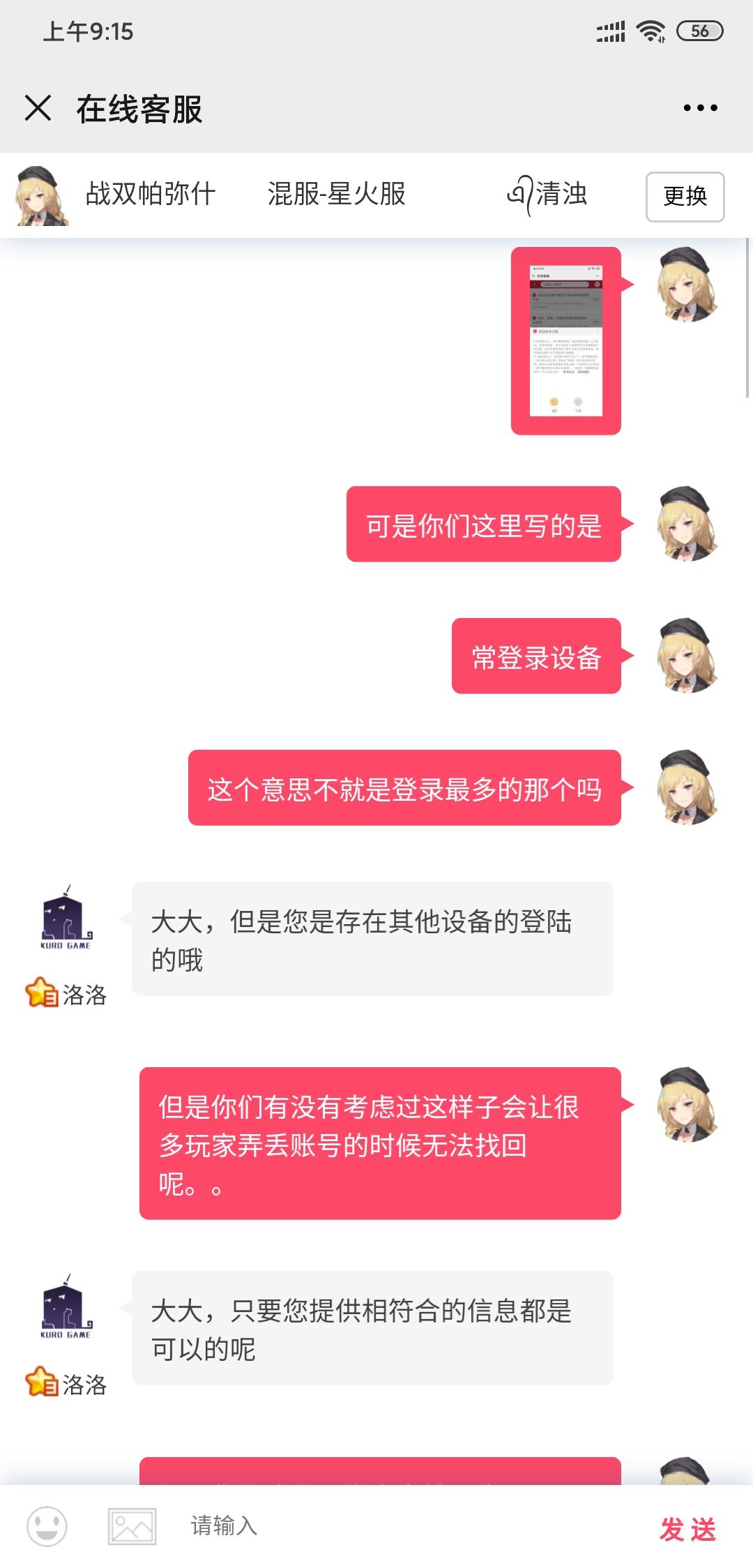 事情是这样的,昨天我把我大号的绑定手机换到我小号上了,然后大号账号就找不到了。这的确是我个人的失误,于是我就去寻求客服的帮助,客服让我在常登录设备注册一个新账号然后往上提交申请,于是就有了下面的过程。这个新注册的账号必须登录之前旧账号登录过的所有设备才能找回自己的账号。我就想知道这是什么操作,开服到现在有半年多了,这期间怎么也给朋友代练什么的玩过一下,这怎么找齐全。于是我就再说我提交实名制信息,人家回复实名信息只能防沉迷???自己实名信息都没法用??于是我说我可以提供账号内很多道具的具体数据,还是不行。紧接着我觉得我提供充值记录和单号总行了吧,然而还是不行。你们账号找回的界面上写的用常登录设备就可以然后整了这么一出。再说我只想找回我自己的账号,没有要更改数据什么的就这么难?你让一个人记住从开服至今每一个登陆过账号并且联系上他们再让他们登录一次新账号?是不是太强人所难了?然后我这个账号就找不回来了。开服半年多的心血就这么没了。还请