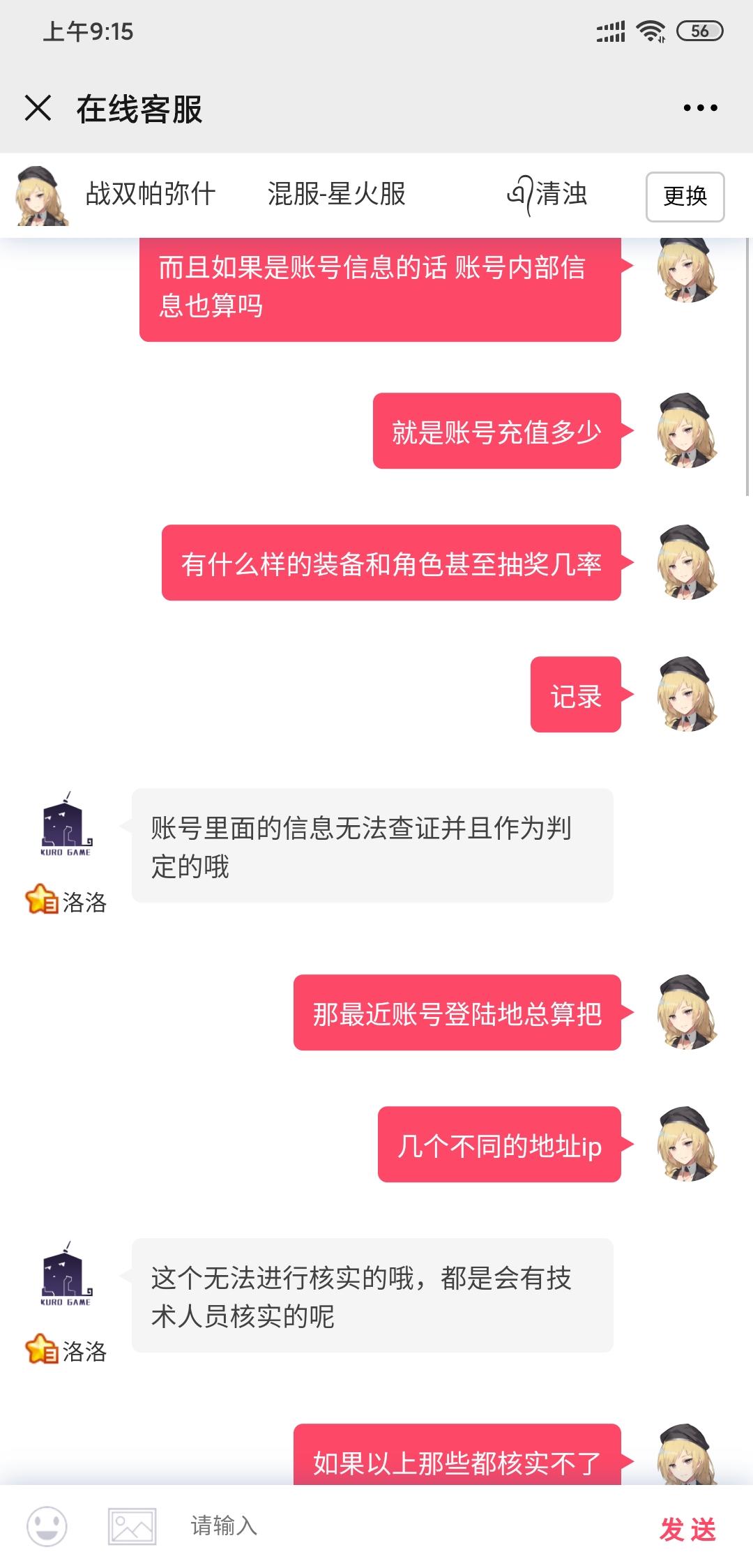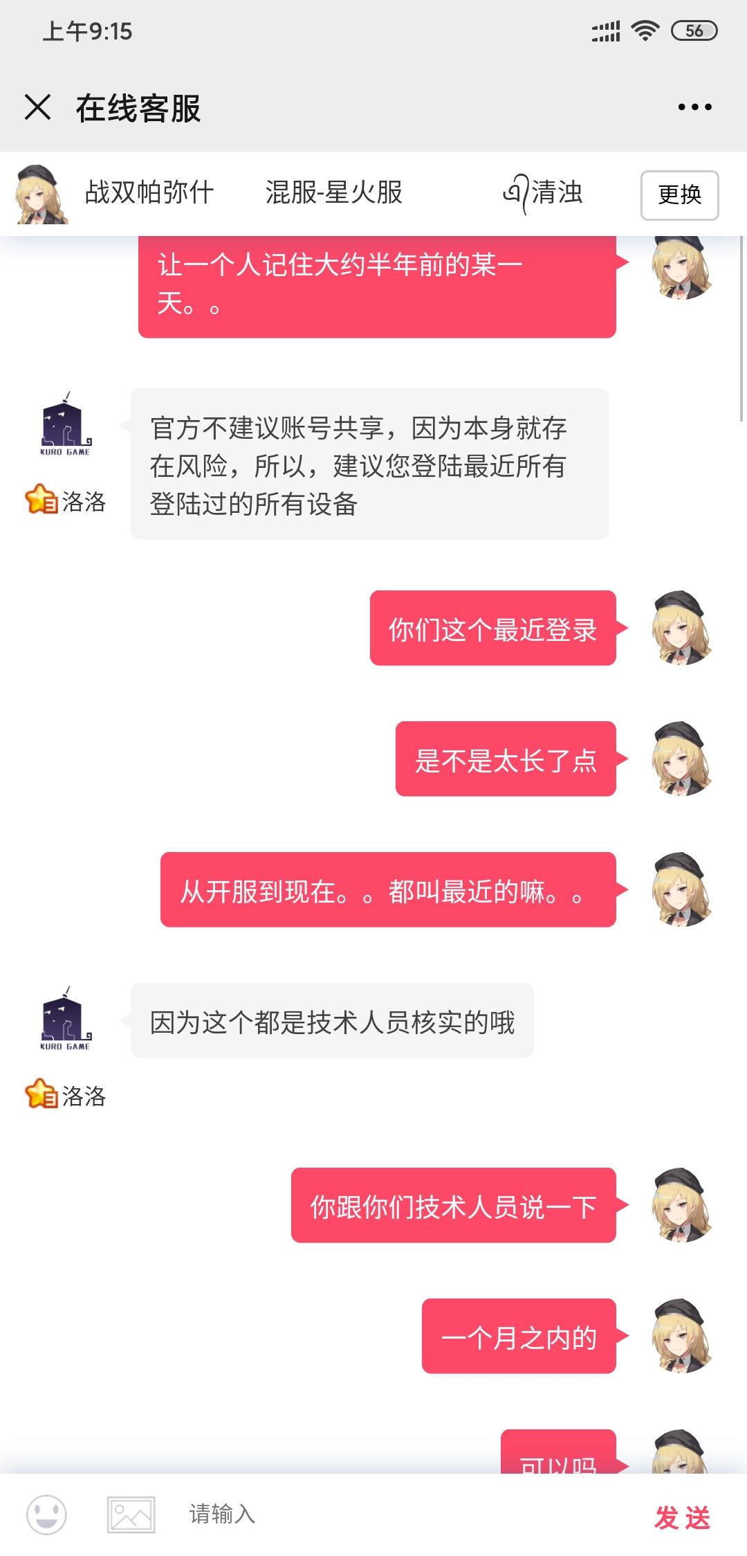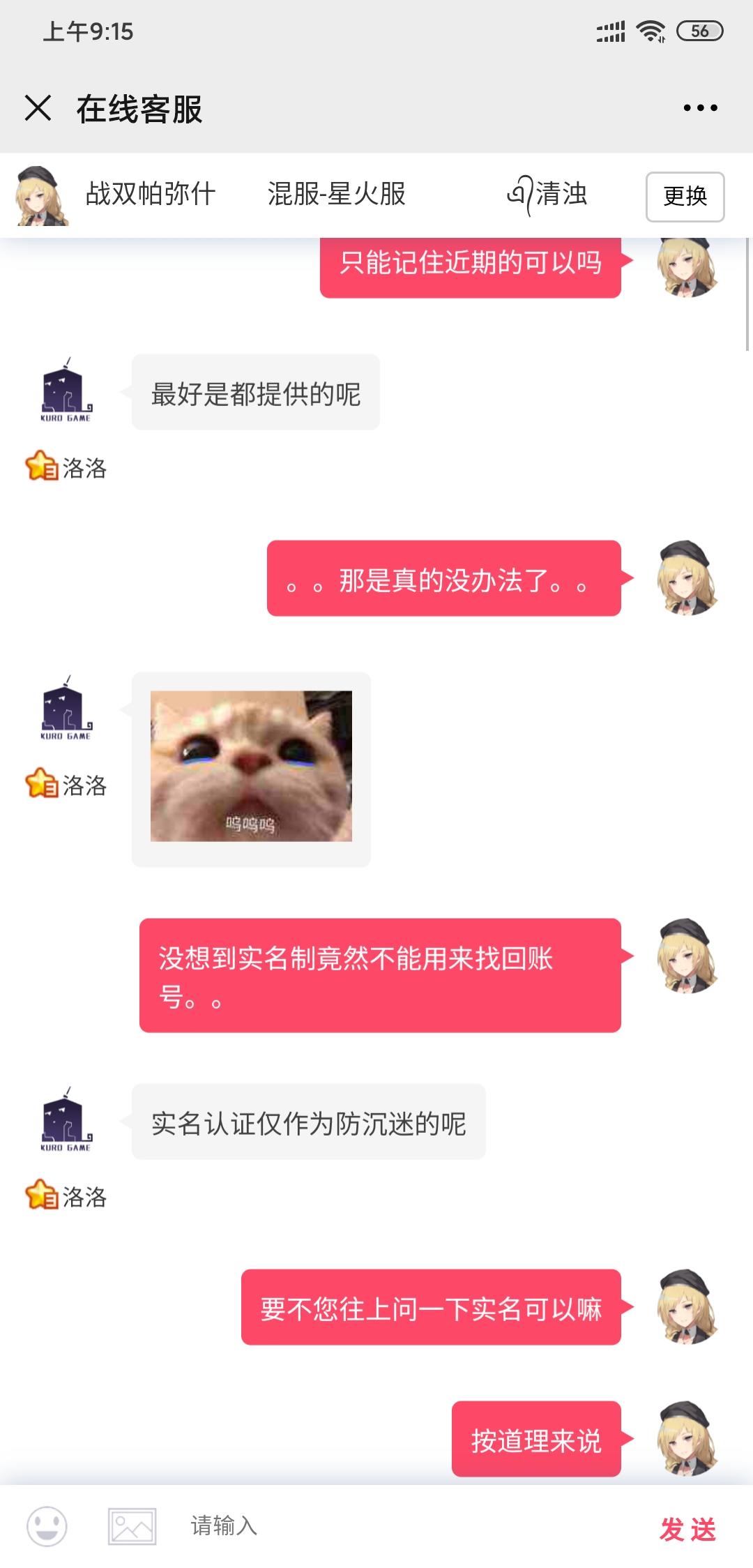 事情是这样的,昨天我把我大号的绑定手机换到我小号上了,然后大号账号就找不到了。这的确是我个人的失误,于是我就去寻求客服的帮助,客服让我在常登录设备注册一个新账号然后往上提交申请,于是就有了下面的过程。这个新注册的账号必须登录之前旧账号登录过的所有设备才能找回自己的账号。我就想知道这是什么操作,开服到现在有半年多了,这期间怎么也给朋友代练什么的玩过一下,这怎么找齐全。于是我就再说我提交实名制信息,人家回复实名信息只能防沉迷???自己实名信息都没法用??于是我说我可以提供账号内很多道具的具体数据,还是不行。紧接着我觉得我提供充值记录和单号总行了吧,然而还是不行。你们账号找回的界面上写的用常登录设备就可以然后整了这么一出。再说我只想找回我自己的账号,没有要更改数据什么的就这么难?你让一个人记住从开服至今每一个登陆过账号并且联系上他们再让他们登录一次新账号?是不是太强人所难了?然后我这个账号就找不回来了。开服半年多的心血就这么没了。还请