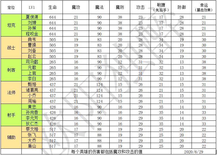 一级英雄的各个属性