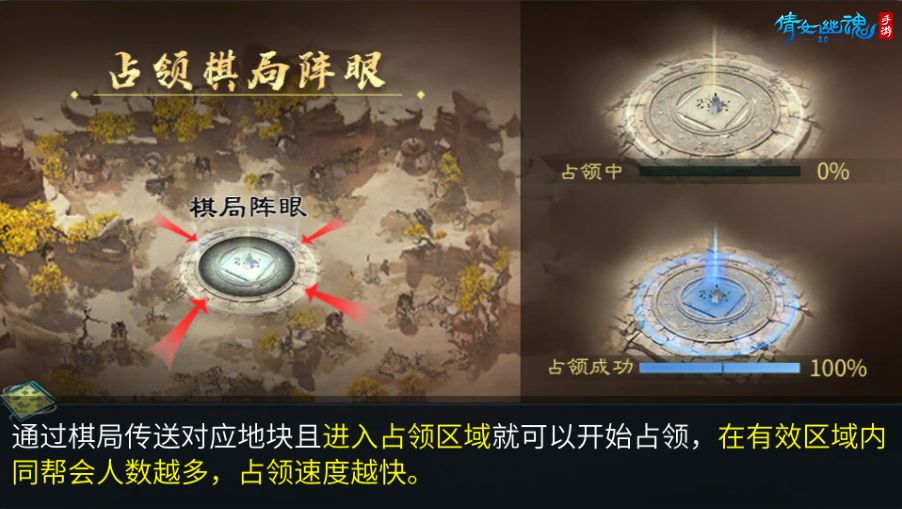 获得资格的帮会需要在每周六19:10集结进入天地棋局,以帮会主城为起点,在留有多处空洞的残缺棋盘上抢占资源点,获取积分奖励,向着“钧天”的中心城进军!