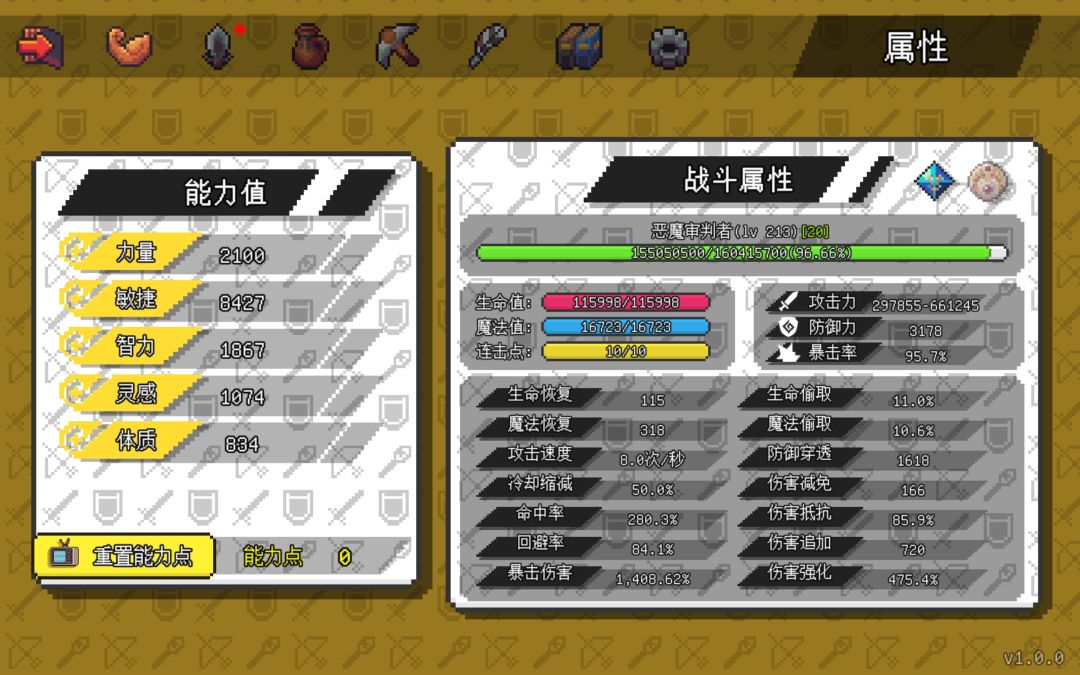 20转恶魔属性面板如图(用森弓战力确实高很多,武器选择160武器攻击力的属性武器,实测之后发现无属性的伤害最高)
