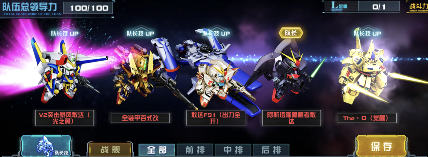 该阵容将无限正义敢达/流星装备作为队长,通过队长技的回复效果进一步增加整体队伍的生存能力,海盗敢达X-0与00敢达七剑配合,双核输出。
