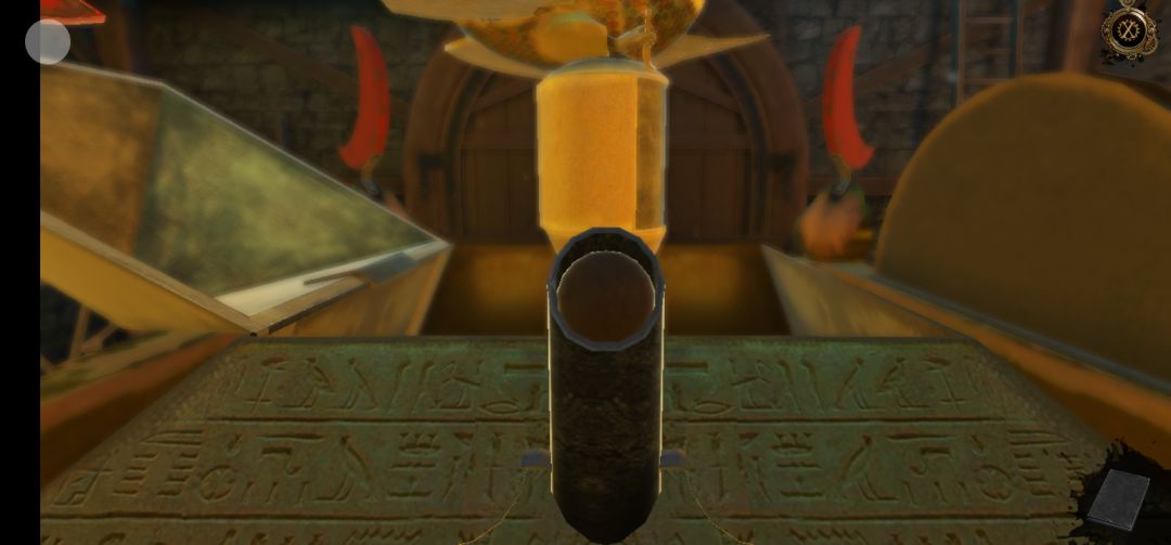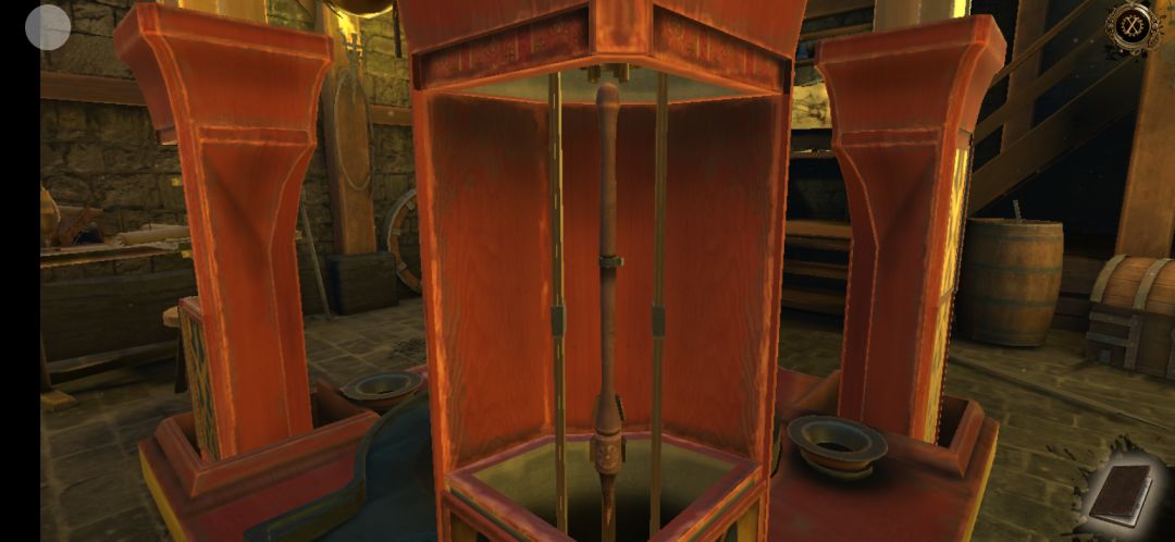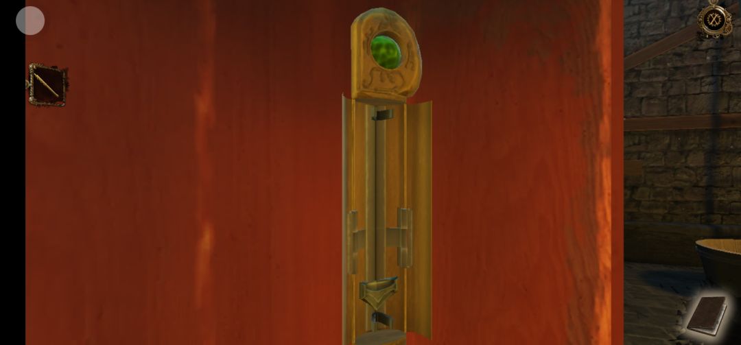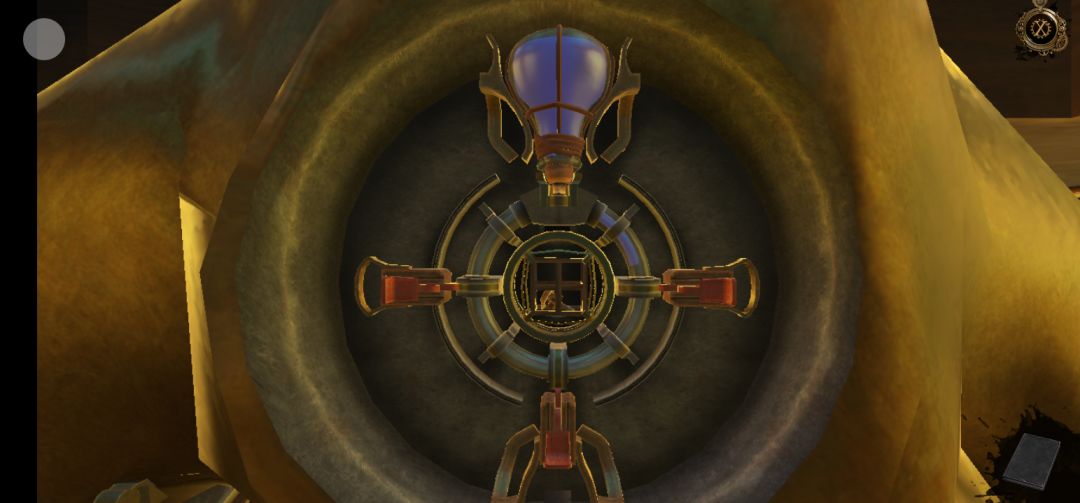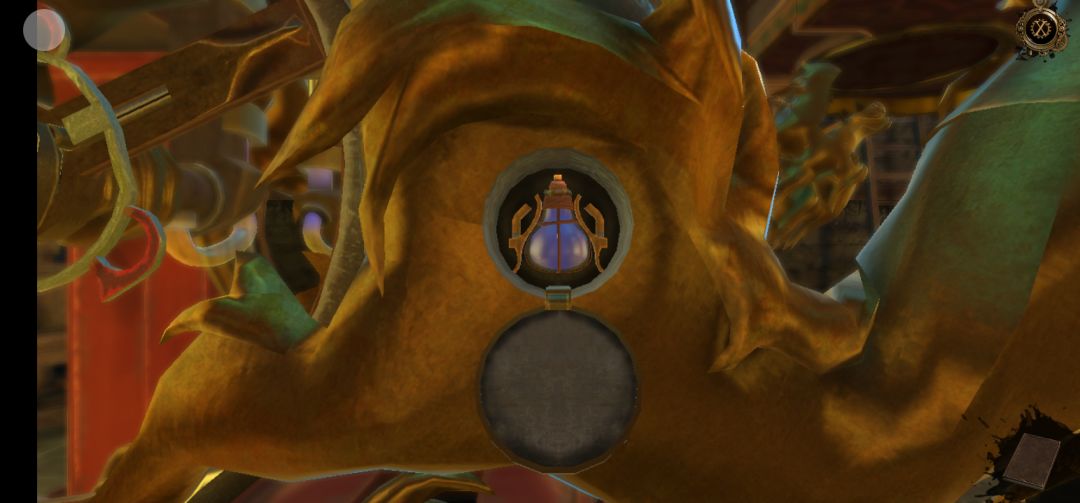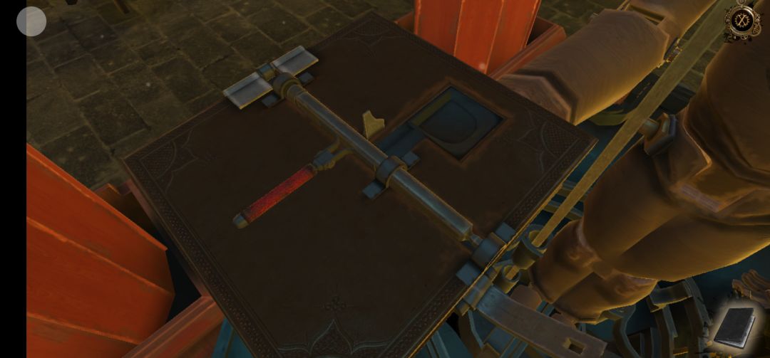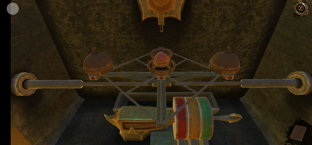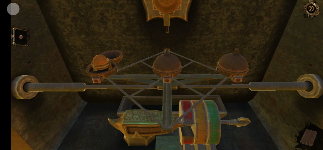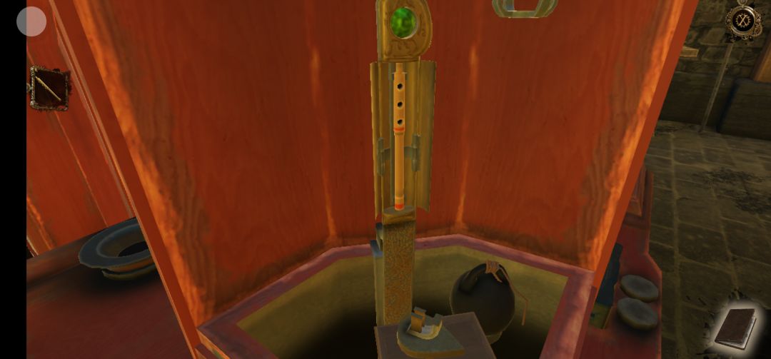 机关开启,点击右侧柱子机关上的红色宝石,得到半截笛子,再拖拽机关里的滑块,得到圆球中的迷你钥匙