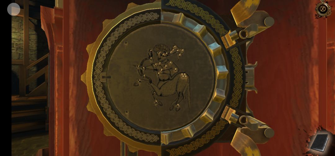 将射手座圆片放入左侧的柱子中,对应圆片上的孔,旋转旁边的齿轮