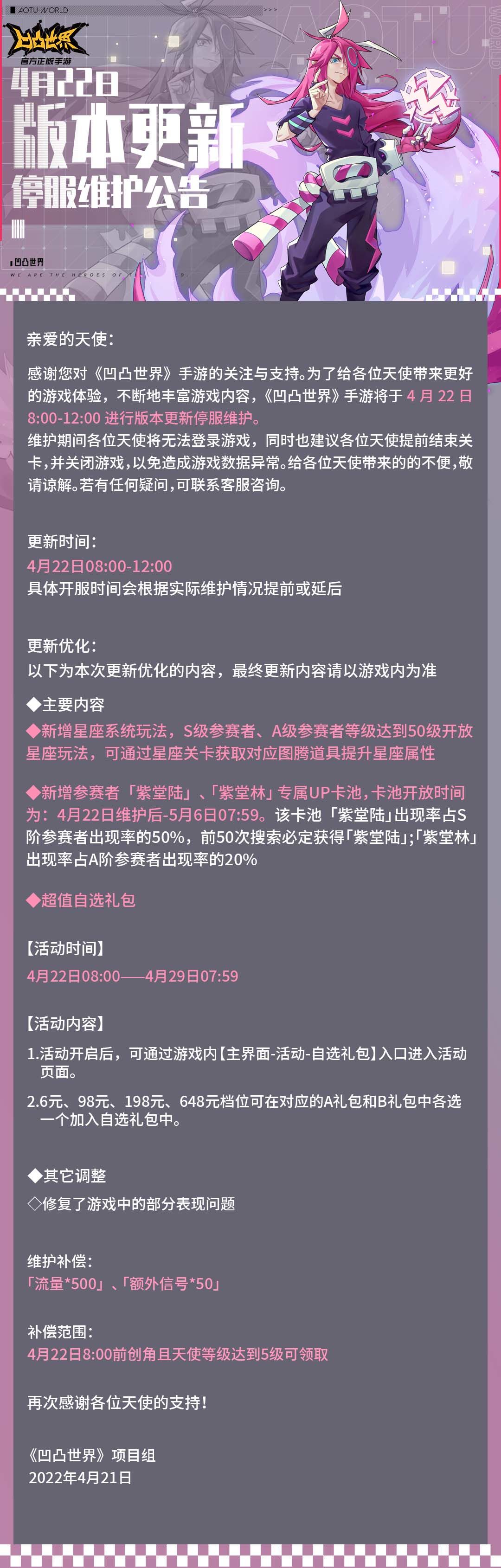 感谢您对《凹凸世界》手游的关注与支持。为了给各位天使带来更好的游戏体验,不断地丰富游戏内容,《凹凸世界》手游将于4月22日8:00-12:00进行版本更新停服维护。