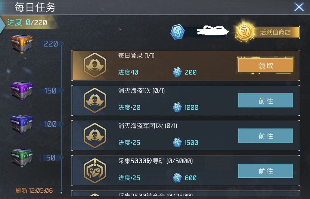 然后就是前期的主线支线任务,在有体力的情况下选择优先完成。可以用钻石去购买体力加快任务完成进度。每一轮完成目标给予的经验和物资都是非常丰厚的,在前期开荒的时候一定是拉满,保证进度。