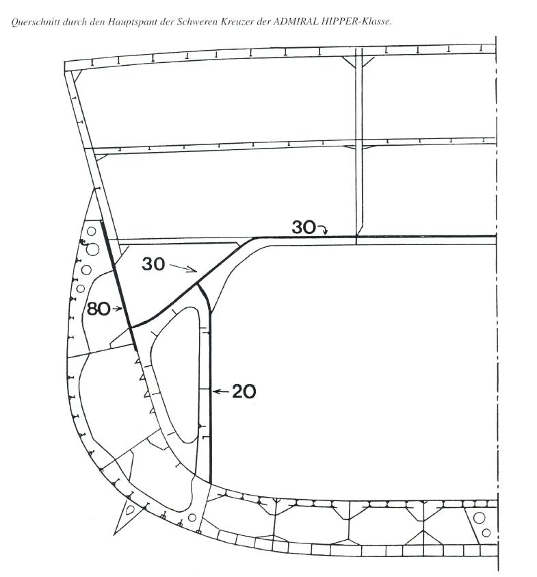 其次,关于希佩尔级的穹甲,有部分资料认为其厚度为50mm。然而在德国海军的官方资料中则将其标为30mm,而具有权威性的M. J. Whitley的著作中也指出,除了A炮塔与D炮塔附近的部分区域加厚至40mm外,其余区域均为30mm,不影响结论。