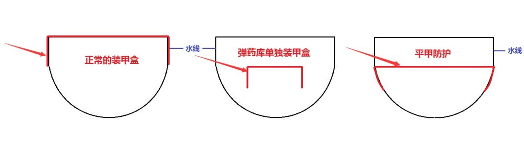 可以看到,欧根亲王采用的并不是通常的装甲盒布局,而是将装甲甲板外端下折与主装甲带的下端相连接,形成了穹甲。这样设计的好处是装甲甲板和主装甲带可以共同参与垂直防护,在总厚度有限的情况下部分提升侧舷防护效果。但是这样做并非没有代价。