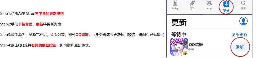iOS13以下的用户,请点击进入App Store,点击右下角更新按钮进入更新页签,手动下拉待更新项目列表,刷新页面,等待刷新完成圈圈消失后,在列表中找到QQ炫舞并点击更新。