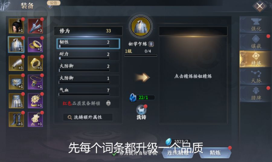 首先天心石的使用,在初始情况下,装备词条都是白色,使用天心石能提升词条品质并刷新属性,在提升的时候为了资源最大化利用,我们从单件装备开始,将白色词条全部洗成绿色,就换下一件装备进行天心石的洗铸,全绿色以后就充第一件开始升蓝色,洗铸全蓝色以后微小氪玩家不是特别建议挖宝箱子全开了,因为升紫色概率没那么高,全蓝色以后精炼等级尽量均衡一点升级就行了,不要一个拉的太高。