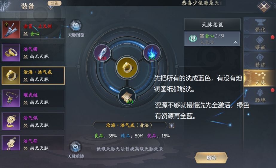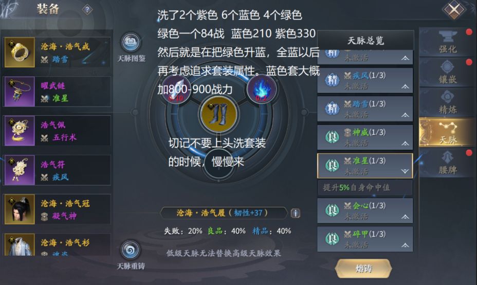 天脉系统是一个看大家欧气的系统,平民玩家只需要点到全蓝色品质就不用再管这个系统了,当有熔铸图纸的时候可以来试一下能不能提升到紫色品质。