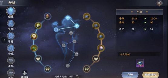 2. 经脉:经脉初期一定先所有的脉络都升5级开奇珍的镶嵌孔位。然后剩下的一定要一条一条的打通,打通一条有额外加成并且能开新的一条经脉。