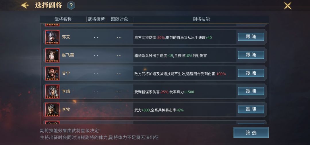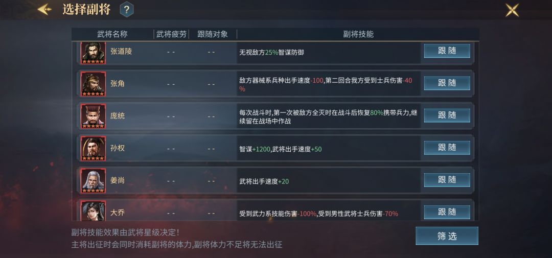 5、刘备、嬴政、田丰、孙权、李靖、关羽——以上副将均没有或者分配不过来,可以考虑这几个作为副将,虽然技能没那么契合张春华,但也是各有其他优势,对张春华的综合能力提升有所帮助,特别是带满星田丰,可以极大加强张春华的技能伤害和免疫各类反弹,属于可开发的另一个副将。