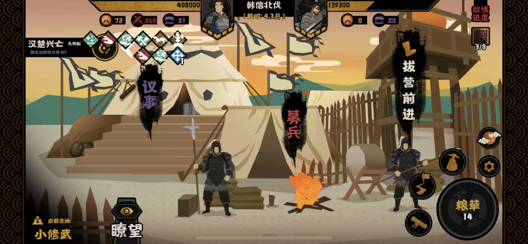 和长平的打法差不多,刘邦要兵的时候一定要给,推荐羲和,技能非常牛批,每个仓库加八粮草,还加2战力,带个妇好,能给步兵加一级,最后九级兵随便平推,粮草用不完,第一次进仓库前攒15粮,羲和两个技能全学要十五粮草。