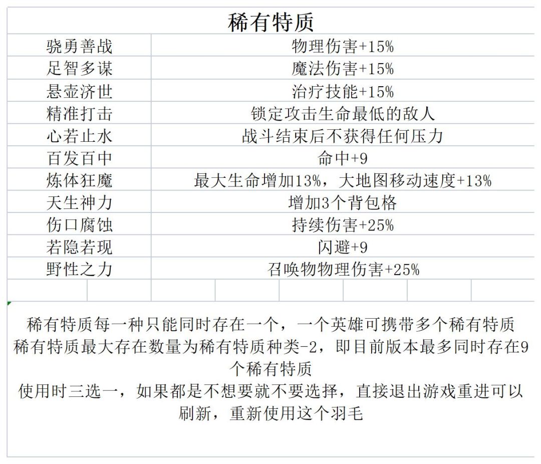 稀有特质图鉴及使用条件
