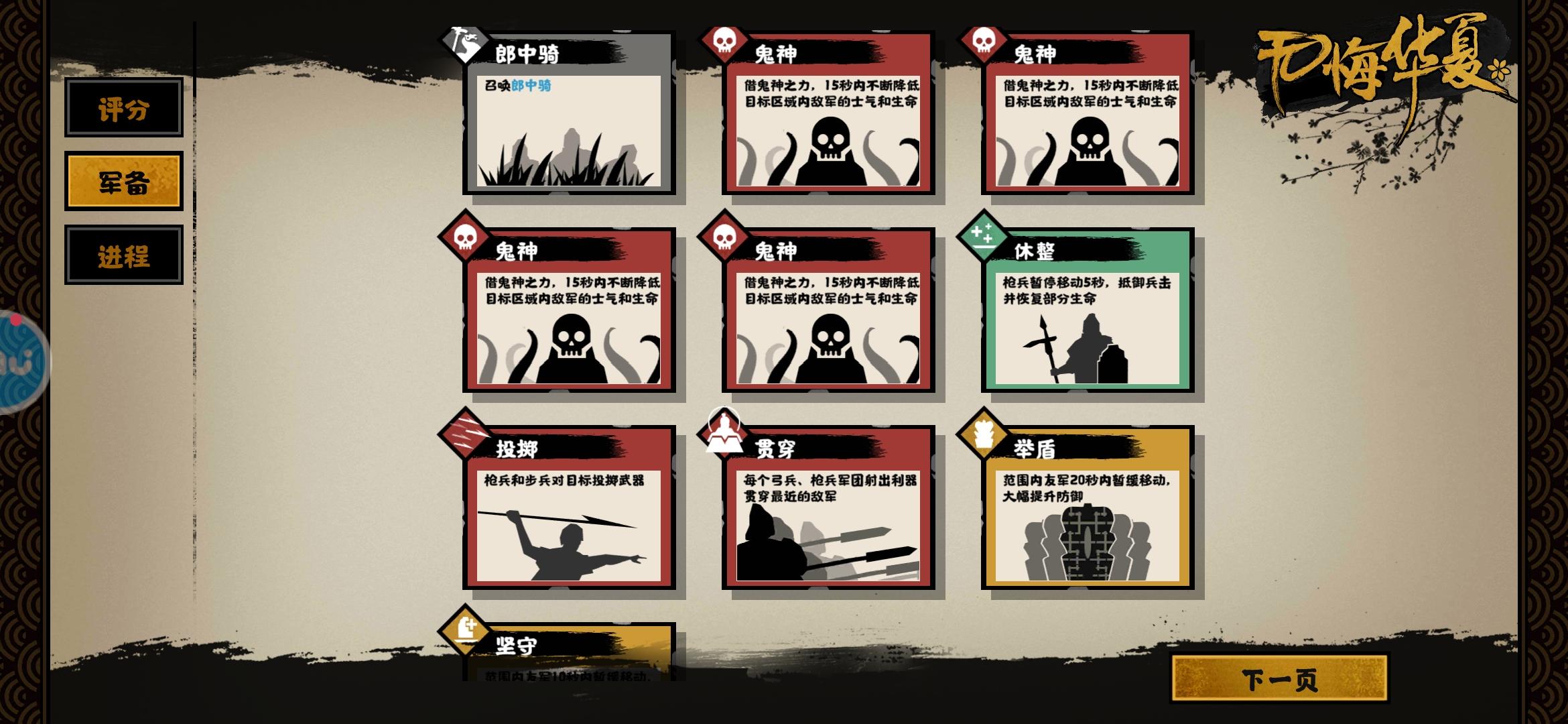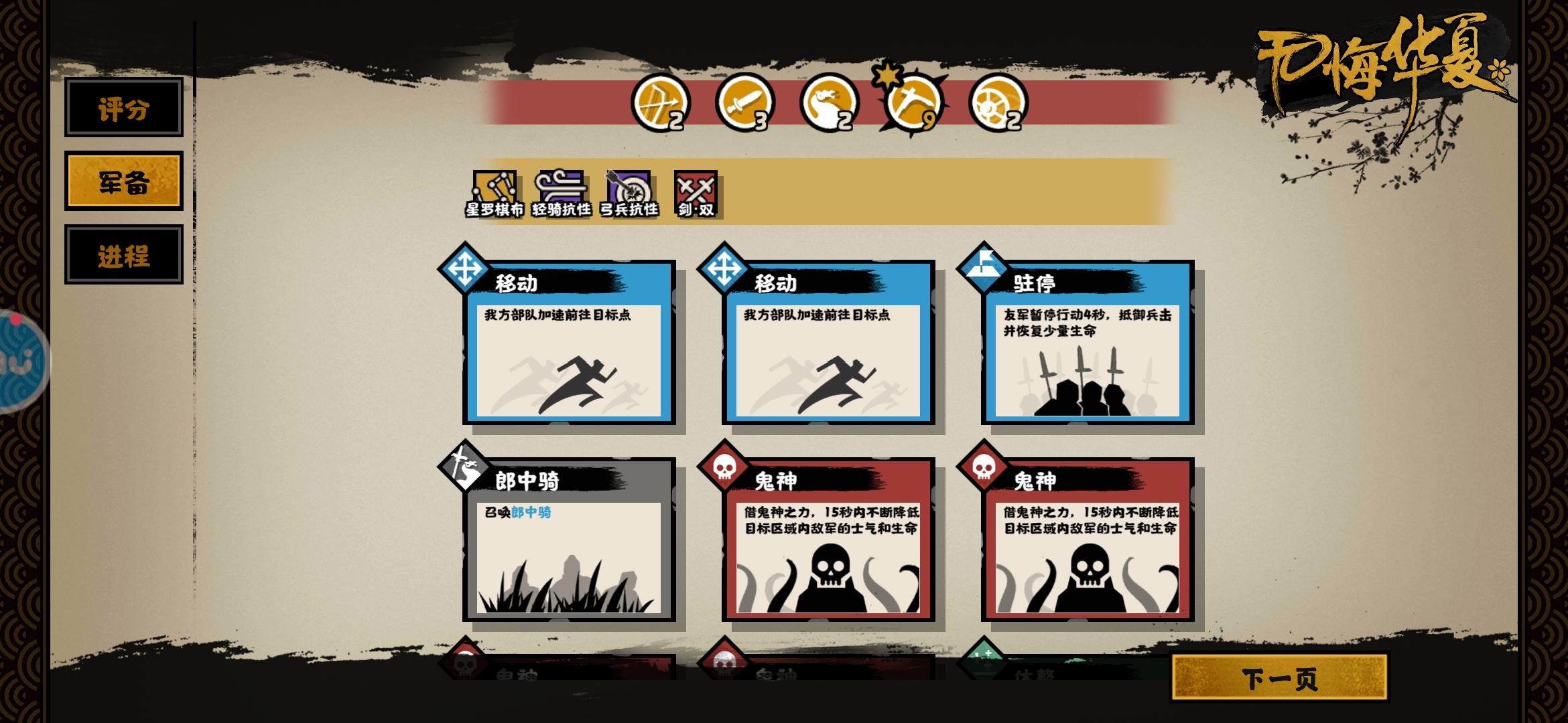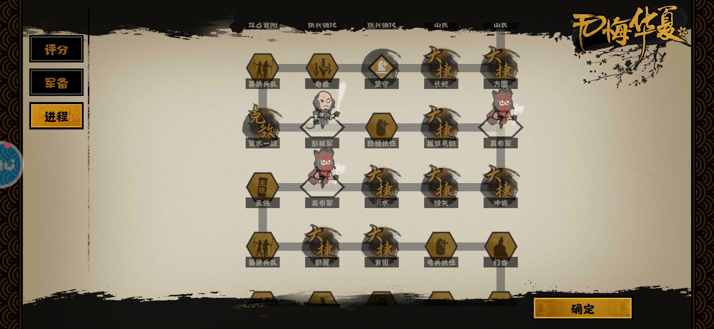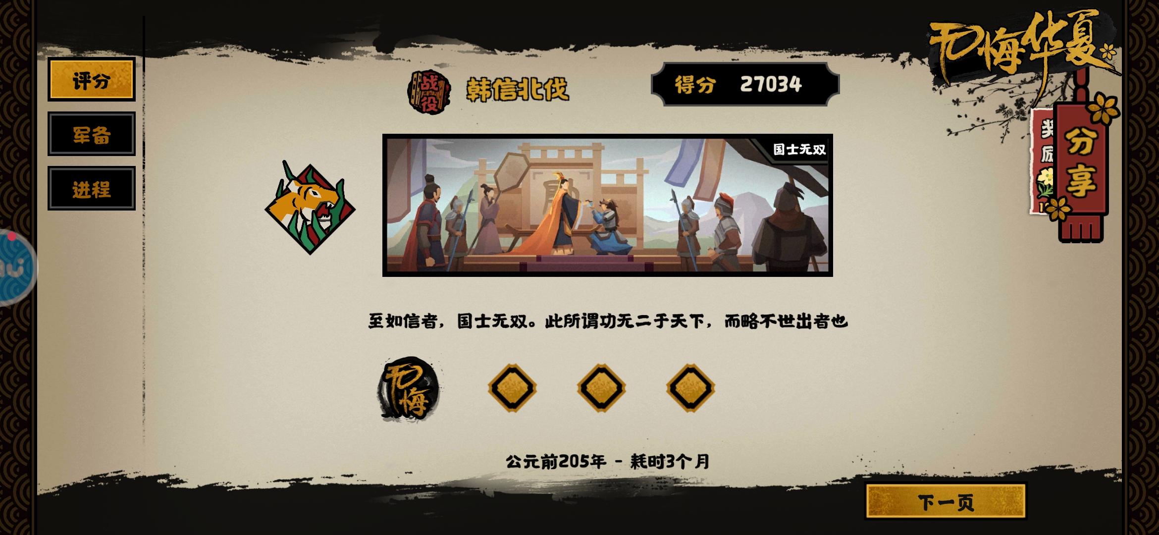 另外说一下怎么3万打10万,第一次绵蔓水(背水一战),虽说感觉应该是过河打,但是我打不过,然后重新打(存档了),还是过河过一半,移动拉回岸上摆枪阵,因为对面骑兵加步兵有移动差,所以先到(应该是6万骑兵),把输出技能一扔再加上克制,尽量保持5个兵团没有团灭,放休整回血打4万步兵就很简单了,第二次3万打十万也是回拉摆枪阵,打不过就提前存档多试几次(抽技能牌),最后一次就很简单,拉河里,一个决堤基本团灭