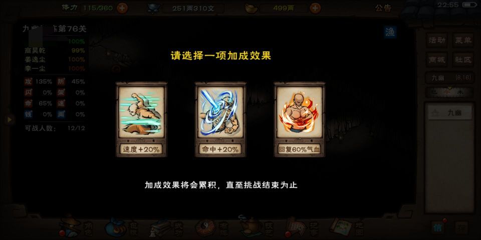 进九幽之前存档(点上传存档,下面称大存档),然后打到第1*3层时即第一次buff出现前时在布阵界面点两次启用阵法(此操作以下称为小存档),如果出现命中或者防御就退出重进(小回档),然后大存档。再打这一层选择命中或者防御,没有就大回档。在5%数值buff阶段不要选攻击,前面选多了攻击后面15%、20%阶段很难再出攻击。