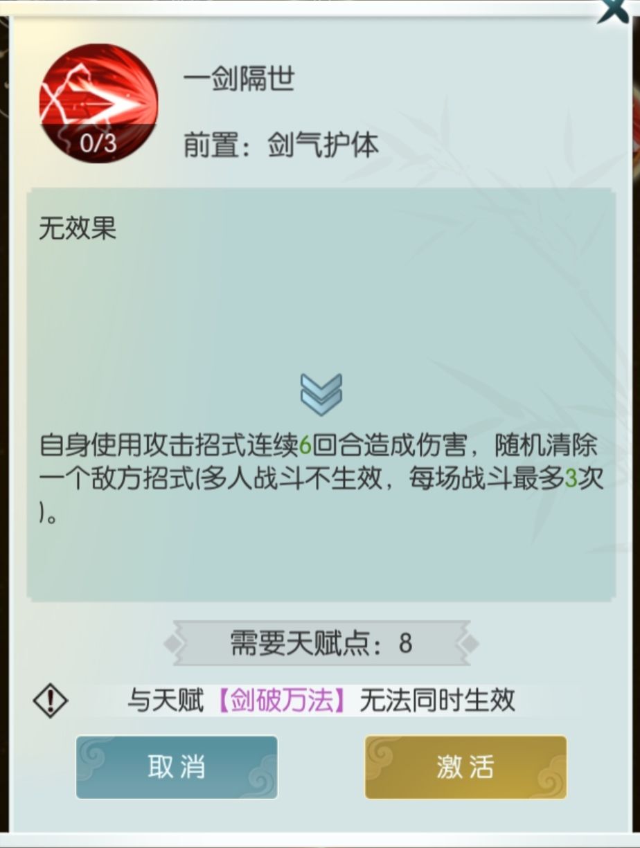 第五天赋应该属于剑右天赋中较难理解,一剑隔世和剑破万法。一剑隔世满级是用攻击招式连续4回合造成伤害随机清除一个招式,这个条件算是非常苛刻,这里的攻击招式必须是主动释放的人物招式,像平A或者五斗或者风林火山这种四回合伤害的灵兽技能都不算。这么一看这个技能好像没用,确实,大多数场合基本没用。但是一剑隔世有个冷知识,那就是这里的消除招式是永久移除,而不是像剑破万法那种暂时性的。