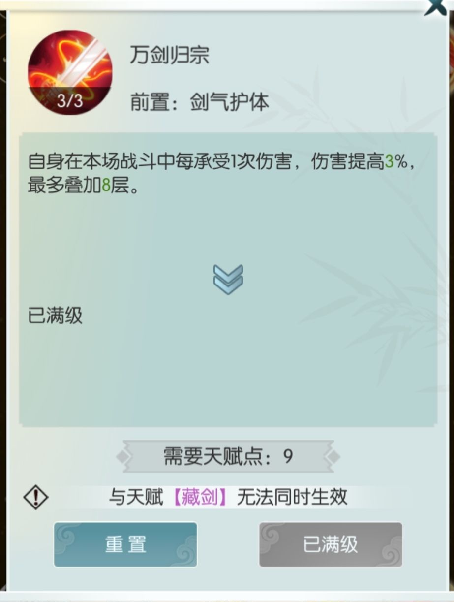 万剑归宗,满级效果是每承受一次伤害增伤3%,最多叠8层。顾名思义,万剑归宗非常适用于万剑这种多人战斗,可以快速叠满增伤,当然打多输出怪也很适合。需要注意的是这里的受到伤害属于被动承伤,即受到反伤伤害不叠加。