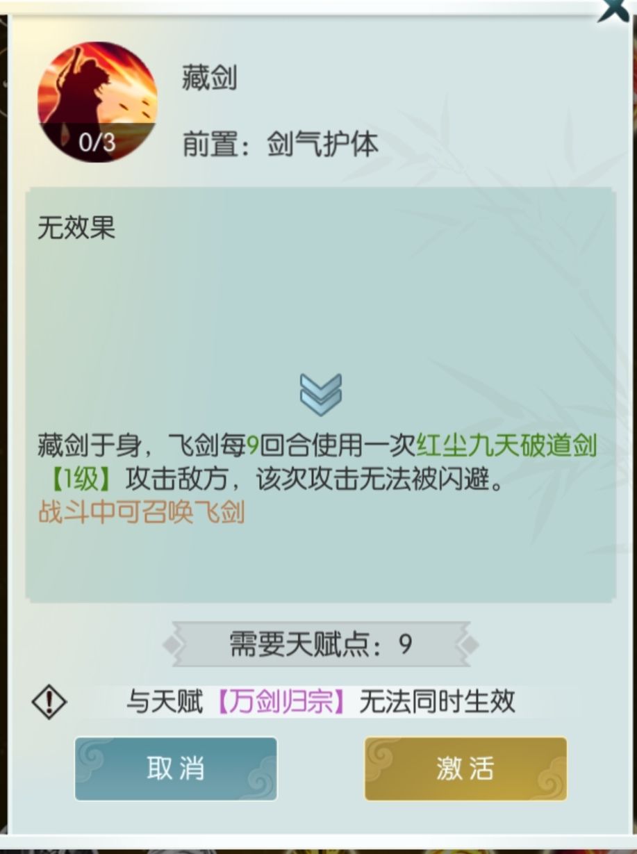 第六天赋就是藏剑和万剑归宗。藏剑效果是每9回合使用一次红尘剑且无法闪避,适用于招式带5buff或者6buff且平A无法破防的情况,补伤害,主要是必中伤害稳定。还有就是敌方出手次数较少的情况(削弱万剑的效果),反正不是万剑就是藏剑,总要带一个的。这里还有一个小细节,就是带藏剑战斗的时候人物剪影里会多一把剑😆。新发现藏剑伤害取决于自身攻击力,自身增伤神通法则或对方减伤神通不影响,打高减伤怪有奇效。