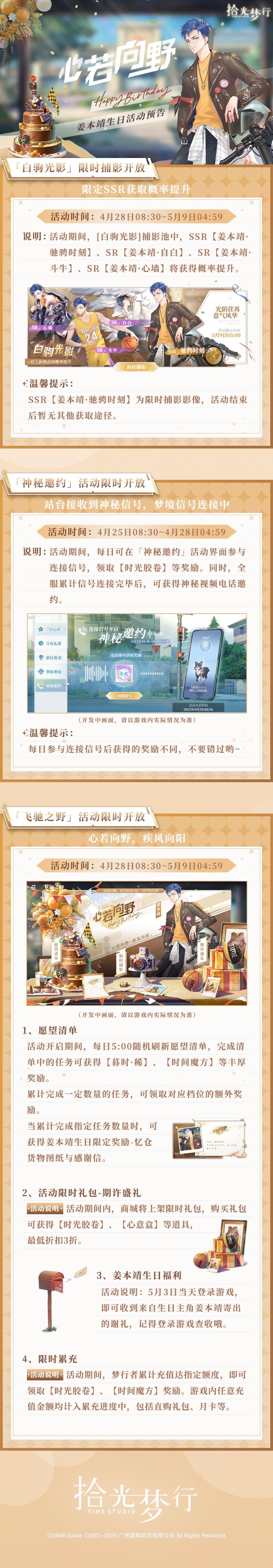 活动时间:4月25日08:30~4月28日04:59,每日可在「神秘邀约」活动界面 ,领取【时光胶卷】等奖励。同时,全服累计信号连接完毕后,可获得神秘视频电话邀约。