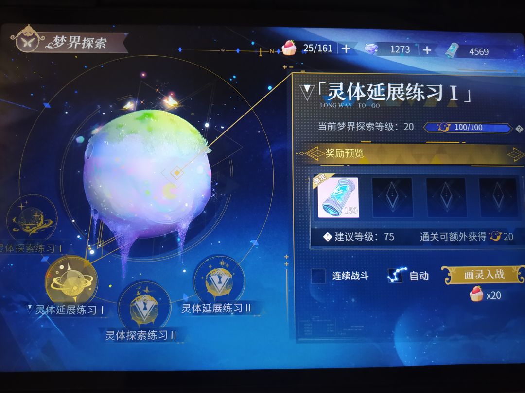6.在结束星门中转站探索之后,点击“灵体延展练习”,开始刷本,此副本没有难度递增机制,打过一次直接刷,一直刷到探索等级为20级停止(探索等级最高为20级,372基地星需要达到探索等级20)