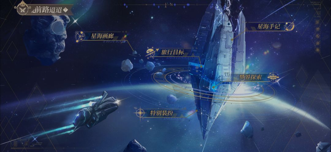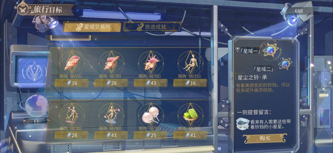 11.成就达成之后,退出“梦界探索”界面,回到“前路迢迢”主界面,点击“旅行目标”(详情见图一),打开“星域交易所”和“旅途成就”,达成成就之后在“旅途成就”中领取对应奖励
