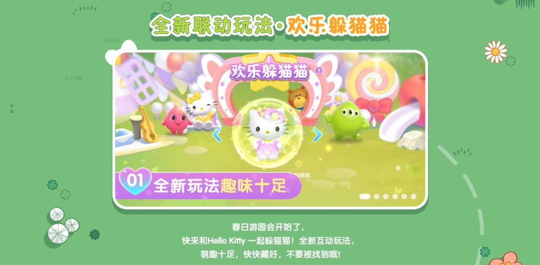 大爆料来了哦!Hello Kitty联动玩法——欢乐躲猫猫,4月30日趣味上线!全新的模式、全新的地图,休闲有趣又悬念迭起!嘘,快藏进进草丛里,别被发现啦!