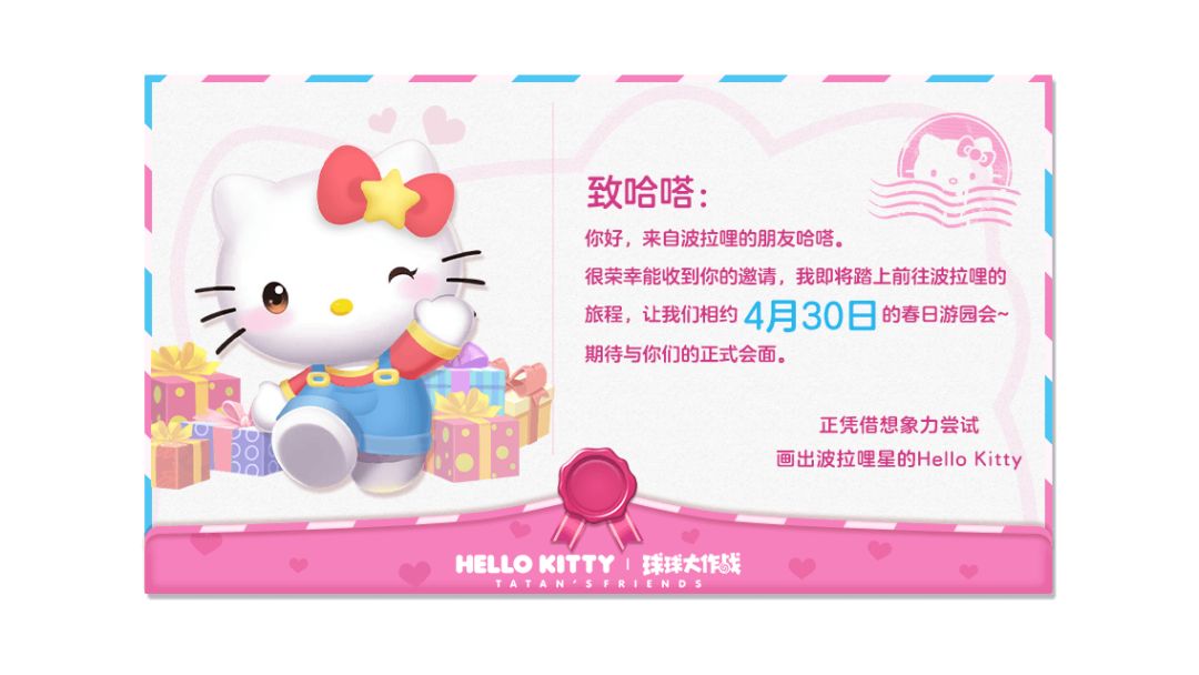 今天,波拉哩收到了Hello Kitty的回信,她将在4月30日的春日游园会上和球宝们正式会面!好期待呀~