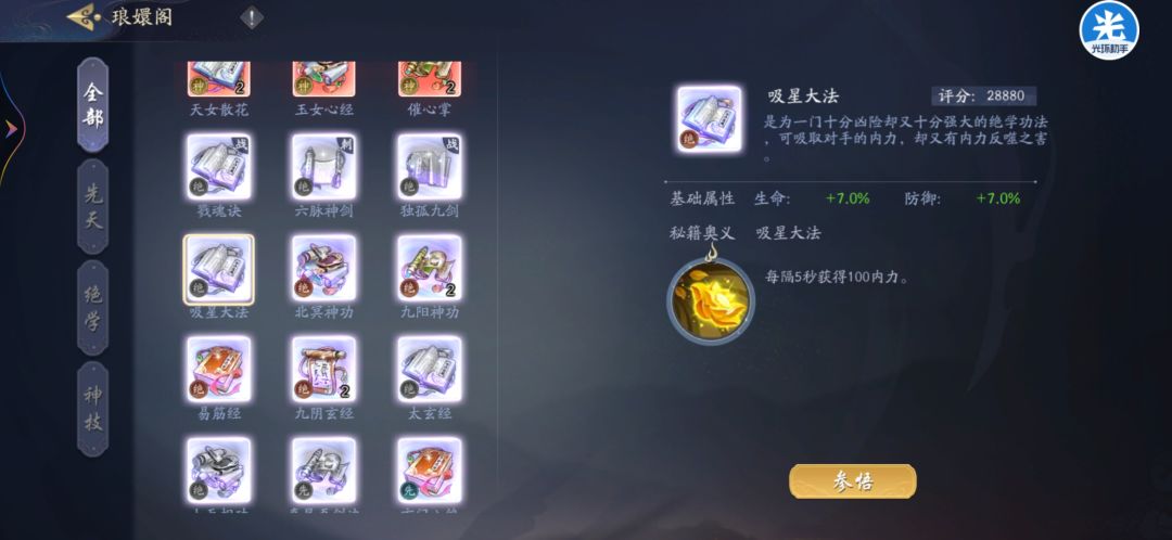 可以迅速获得内力,让侠客的大招更快的释放出来,万金油秘籍,所有侠客都可以装备,建议装备武当,与天师搭配能够更快放出两次大招