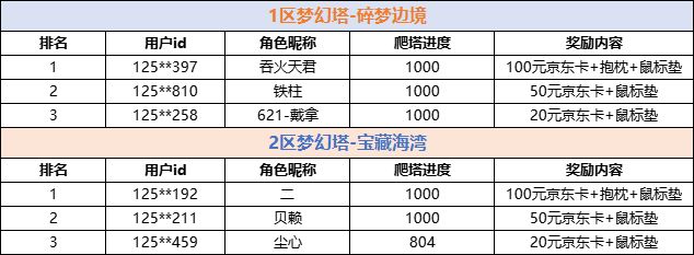 活动期间,解锁并参与梦幻树玩法,至活动结束时间,取各区服梦幻塔排行前三数据发放奖励,具体奖励内容为: