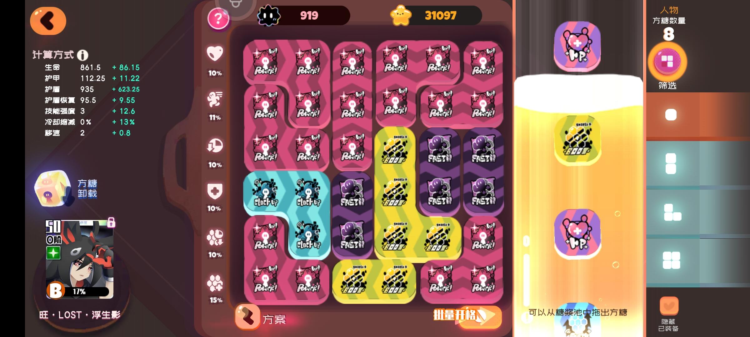 养成资源分配,不是说升等级就是养成,升级资源很多你可以升很多人物啥的,但是没啥用,要真的让人物变强要开方糖格子,上方糖,相同人物用来升格,洗词条啥的才能让人物变强。