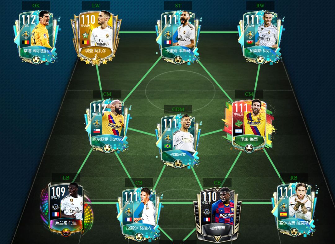本次西甲队套选择433控球阵型,目前实时对战热门阵型之一。前场三叉戟由皇马前场阿扎尔、本泽马和贝尔组成;中场则由梅西、比达尔和卡塞米罗指挥掌控节奏;后场则是由门迪、拉莫斯镇守两侧,18年法国队冠军中后卫组合瓦拉内、乌姆蒂蒂镇守中路,库尔图瓦把守大门。三线分别由八位皇马球员和三位巴萨球员搭配,进攻的冲击力及稳固的防线绝对不会让玩家失望。