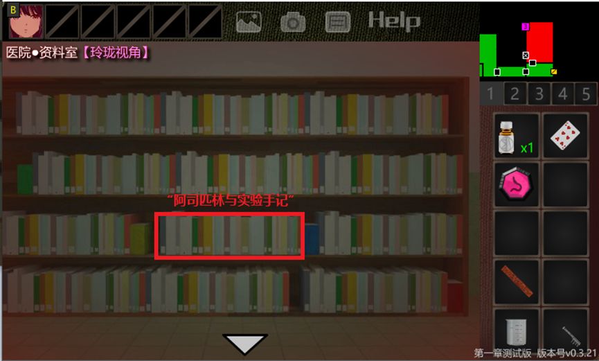 11.先去右边的门,进入【医院·(黑夜)档案室】,点击书架,拍下来。再点中间的书,可以看到“阿司匹林和实验手记”线索,拍下来。