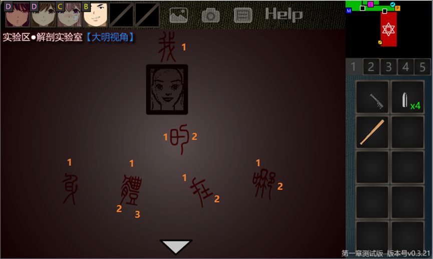 25.剧情结束后,回到【实验区·解剖实验室】,后退,左转,再次点击墙上的字画触发剧情,此时选择【阻止大明】,发现与22步不同,大明可以砸墙。触发条件表明我们应该掌握了线索,重新回想到孤岛问题。