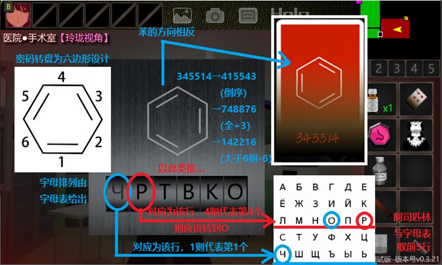 彩蛋:把【扑克牌】投进烧杯,得到【浸泡过“浓硫酸”的扑克牌】,再翻转查看红色背景、画有苯环、下端显示6位密码(随机)的扑克牌背面。解开左侧柜子的苯环密码,得到【张月鹿之象征】(粉色徽章)。(目前为非必要步骤)