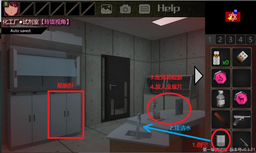 点击左侧柜子,有NOTICE格子,获得【醋酸.酐】。把【烧杯】的【浓硫酸】倒掉(点击“还原”),接最前面的池子接到【清水】,点击右侧量筒,可以配置试剂。