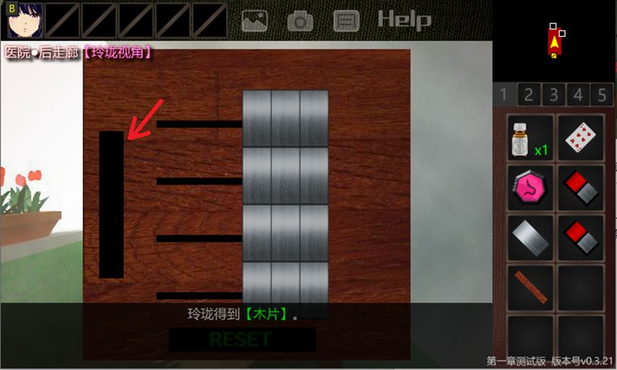 8.点击装置,左侧可以尝试反复点击,直到点击到对应位置,获得【木片】。回收【金属片】-3(按reset),后退。点击右边门进入【医院·(白天)资料室】。