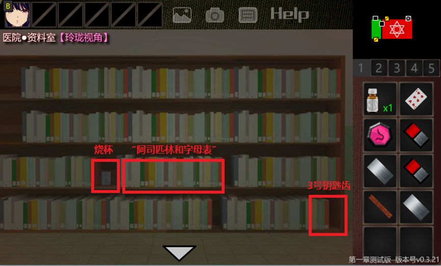 9.回收桌子的【金属片】-4,右转点右侧的书架,取走【烧杯】并点击中间的书(具体位置为烧杯右侧一螺),可以看到“阿司匹林和字母表”线索,拍下来。点击右下角,有NOTICE格子,得到【3号钥匙齿】。组合手中的【轸水蚓之象征】和【3号钥匙齿】,得到【轸水蚓之钥-3】。
