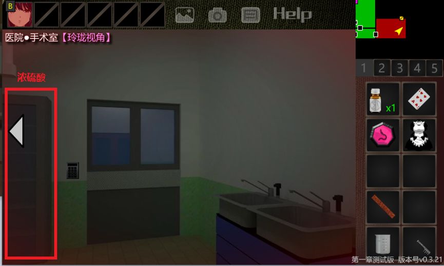 12.回到【医院·(黑夜)后走廊】,现在去后面的门,进入【医院·(黑夜)手术室】。取走手术台上的【人偶的躯干】,右转,再点击左侧柜子,有NOTICE格子,得到【浓硫酸】。