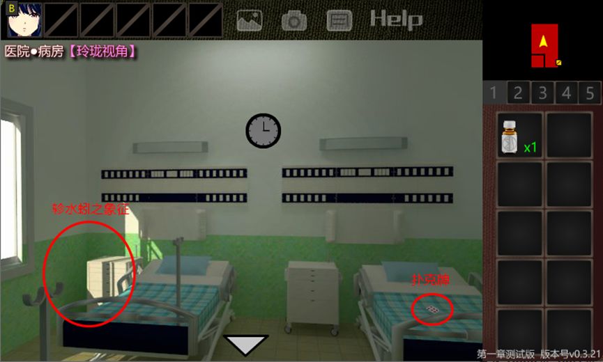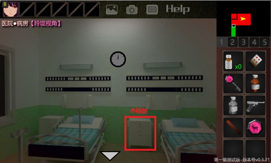 18.回到最初房间【医院·(白天)病房】,装到前面的装置组成红十字,“回”开启。回到【医院·(黑夜)后走廊】然后走3号门、棺材门到【医院·(白天)手术室】,开前面的门2次,进入【医院·(黑夜)前走廊】。用【轸水蚓之钥-3】解开前面的门,进入【医院·(黑夜)病房】,点击右边柜子,有NOTICE格子,发现竟然是【水杨酸】x1,可以配止痛药了。
